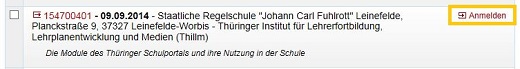 Bei erfolgreicher Suche werden alle Veranstaltungen in einer Trefferliste angezeigt, die genau diese Suchbedingungen erfüllen. Sie können dabei die Zahl der Treffer pro Seite individuell einstellen- in der Voreinstellung werden 20 Treffer/Seite angezeigt. Alle Veranstaltungen, an denen man sich online anmelden kann, sind in der Trefferliste mit einem Link ANMELDEN versehen, wenn Sie als Nutzer am Thüringer Schulportal eingeloggt sind. Im Fall, dass Sie sich als Nutzer noch nicht am TSP angemeldet haben, wird hier der Link ANMELDEN NACH ZUGANG ausgegeben.