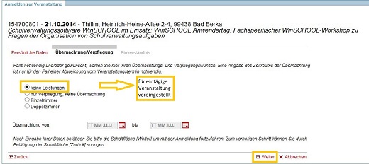 Die Mehrzahl der angebotenen Veranstaltungen ist eintägig. In allen diesen Fällen trifft in diesem zweiten Assistentenschritt die Voreinstellung "keine Leistungen" zu, da Verpflegungsleistungen nicht übernommen werden.