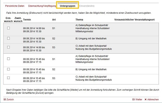 Sie können darüber hinaus optional jeweils für einen Anmeldeblock einen Erstwunsch und n Zweitwünsche markieren, damit Sie im Falle einer eventuellen Überbuchung oder des Ausfalls einer Untergruppe einer anderen Untergruppenveranstaltung zugeordnet werden können.