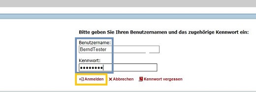 Es erscheint nun ein Anmeldefenster, in dem Sie bitte Ihren Benutzernamen und das zugehörige Kennwort eingeben und anschließend die Schaltfläche 'Anmelden' betätigen. Bei nicht korrektem Benutzernamen oder Kennwort erfolgt eine entsprechende Rückmeldung.