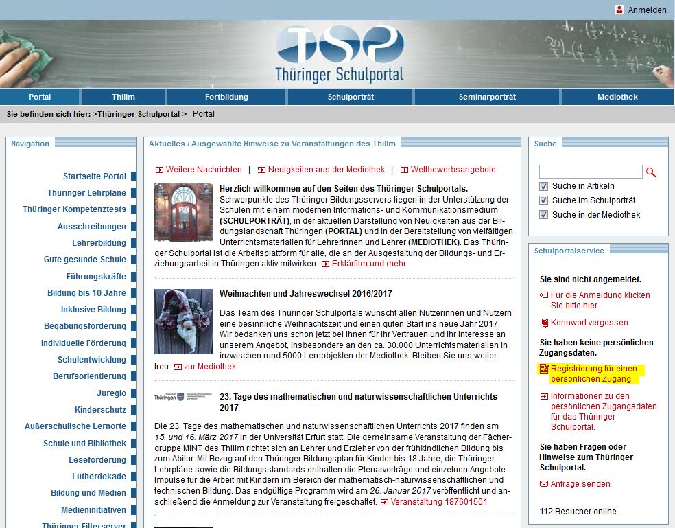 Falls Sie noch keine persönlichen Zugangsdaten zum Thüringer Schulportal besitzen, registrieren Sie sich erst über den Link "Registrierung für einen persönlichen Zugang" auf der Startseite des Thüringer Schulportals http://www.schulportal-thueringen.de