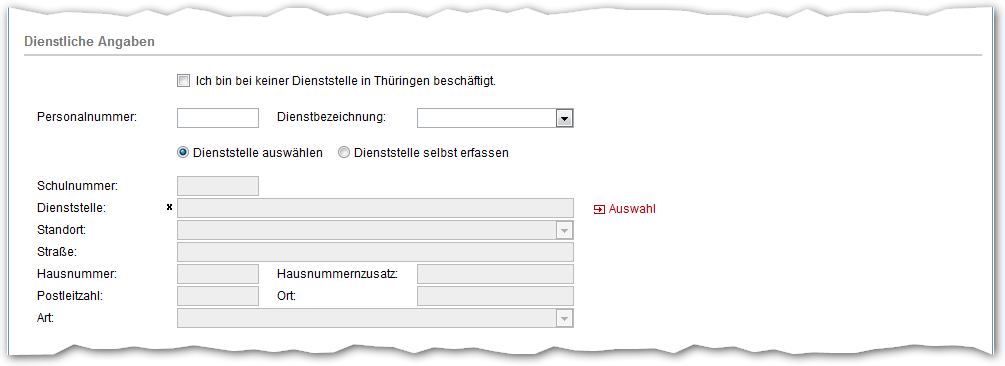 Wenn Sie nicht bei einer Thüringer Dienststelle beschäftigt sind, müssen Sie dies durch einen Haken bei "Ich bin bei keiner Dienststelle in Thüringen beschäftigt." angeben – in diesem Fall sind keine weiteren Angaben zur Dienststelle notwendig.