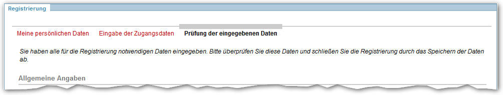 In der Registerkarte "Prüfung der eingegebenen Daten" werden im oberen Teil zunächst die von Ihnen in den vorherigen Registerkarten erfassten Daten angezeigt. Überprüfen Sie diese Daten bitte nochmals!