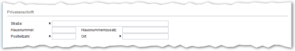 Pflichtangaben sind die Felder "Straße:", "Postleitzahl:" und "Ort:". Darüber hinaus können Sie in den Feldern "Hausnummer:" und "Hausnummernzusatz:" Angaben machen, wenn dies bei Ihrer Privatanschrift zutrifft oder hilfreich ist.