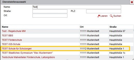 Wählen Sie anschließend aus der Trefferliste die korrekte Dienststelle aus.