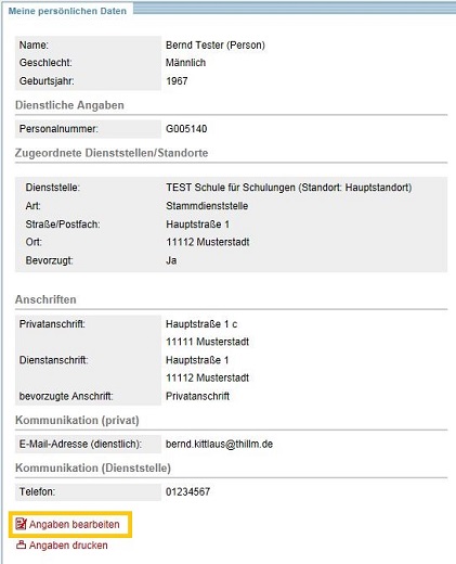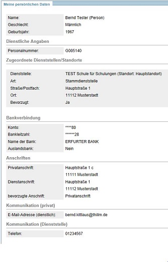 Wählen Sie den Link MEINE PERSÖNLICHEN DATEN. Der sich öffnende Bereich enthält Angaben zu Ihrer Person, zu Ihrer Dienststelle oder Ihren Dienststellen, zu Kommunikationsdaten und ggf. zu Ihrer Bankverbindung. Um die Angaben bearbeiten zu können, wählen Sie bitte den Funktionslink ANGABEN BEARBEITEN in der Box "Meine persönlichen Daten".