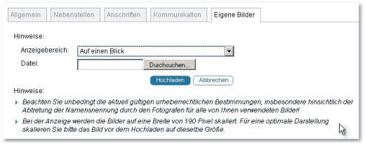 Sie können das Porträt durch eigene Bilder im .jpg oder .gif Format ergänzen, wobei das .jpg Format empfohlen wird. Die Bilder sollten eine Breite von 190px besitzen. Die empfohlene Höhe beträgt 143px. Es erfolgt beim Anzeigen eine automatische Skalierung des Bildes auf eine Breite von 190px, allerdings keine Anpassung der Dateigröße.
