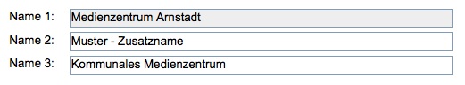 Name 3: Um eine einheitliche Zuordnung aller Medienzentren in unserem System zu erreichen, wird als Name 3 "Kommunales Medienzentrum" vorgegeben. Dieser Name wird im Porträt nicht angezeigt. Bitte ändern Sie diesen Namen nicht.