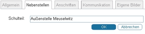Zu jedem Hauptstandort eines Medienzentrums können beliebige Nebenstellen aufgenommen werden. Hierzu muss zuerst im Reiter "Nebenstellen" eine Bezeichnung der Nebenstelle mittels Freitextfeld 'Schulteil' erfasst werden.