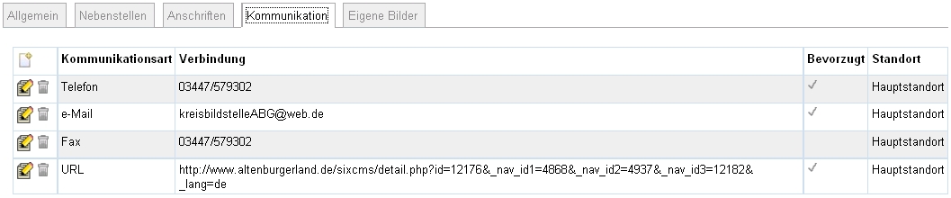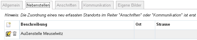 Anschließend können für diese Nebenstelle Anschrift und Kommunikationsdaten erfasst werden. Alle erfassten Daten erhalten ein entsprechendes Nebenstellenkennzeichen in den jeweiligen Auflistungen. Für das Löschen einer Nebenstelle müssen zuerst alle zugehörigen Anschriften und Kommunikationsdaten gelöscht werden.