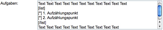Zur besseren Übersicht können innerhalb der Textfelder Aufzählungen eingefügt werden. Hierzu muss die Aufzählung mit [list] begonnen und mit [/list] geschlossen werden. Alle Aufzählungspunkte starten mit [*].