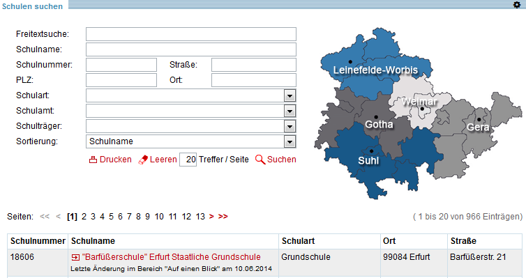 Bei Suche nach einem konkreten Schulnamen sollte das gleichnamige Feld benutzt werden. Verwenden Sie ggf. vor dem verwendeten Suchwort einen Platzhalter. Möglich sind * und %. Für die Suche nach der Schule Staatliche Grundschule "Max Mustermann" Musterstadt sollte man als Suchbegriff *Mustermann oder %Mustermann verwenden.