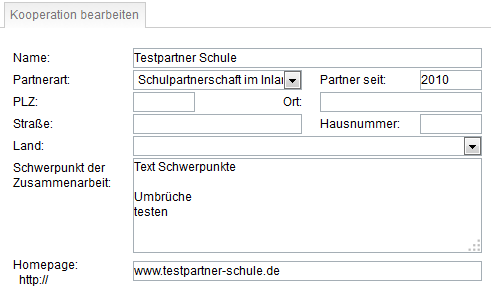 Im Eingabefeld "Homepage" besteht die Möglichkeit, eine URL zu einer bestehenden Webseite des jeweiligen Partners anzugeben. Hierbei wird das Protokoll ("http://") nicht angegeben.