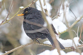 Das Foto hehört zur Serie "Amseln". Es zeigt eine Amsel (Turdus merula), auch Schwarzdrossel genannt, eine Vogelart der Familie der Drosseln. Die Männchen sind schwarz gefärbt und haben einen gelben Schnabel, das Gefieder der Weibchen ist größtenteils dunkelbraun. Es gelten die Nutzungsbedingungen der Mediothek und Pixiothek.