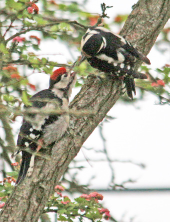 Das Foto hehört zur Serie "Spechtvögel". Es zeigt einen Buntspecht-Altvogel (Dendrocopos major), der einen Jungvogel füttert. Es gelten die Nutzungsbedingungen der Mediothek und Pixiothek.