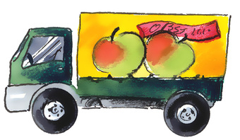 Das Bild gehört zur Serie "Transport". Es zeigt einen gezeichneten LKW zum Transport von Obst. Es gelten die Nutzungsbedingungen der Mediothek und Pixiothek.