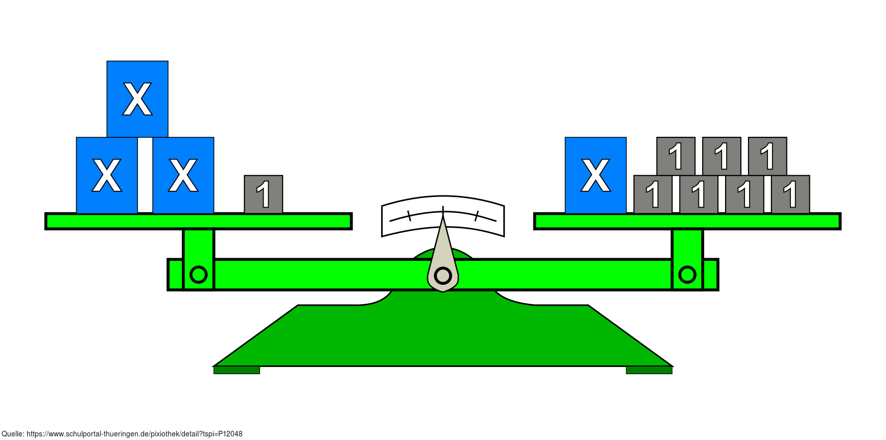 Das Bild gehört zur Serie "Mathematik, Gleichungen". Es veranschaulicht die Lösung einer linearen Gleichung durch Äquivalenzumformung mit dem Bild einer Waage. Zur Gleichung 21 veranschaulichen die Bilder 21-1 bis 21-4 die Umformungsschritte. Das Bild ist unter CC0 lizenziert und kann somit frei verwendet werden.