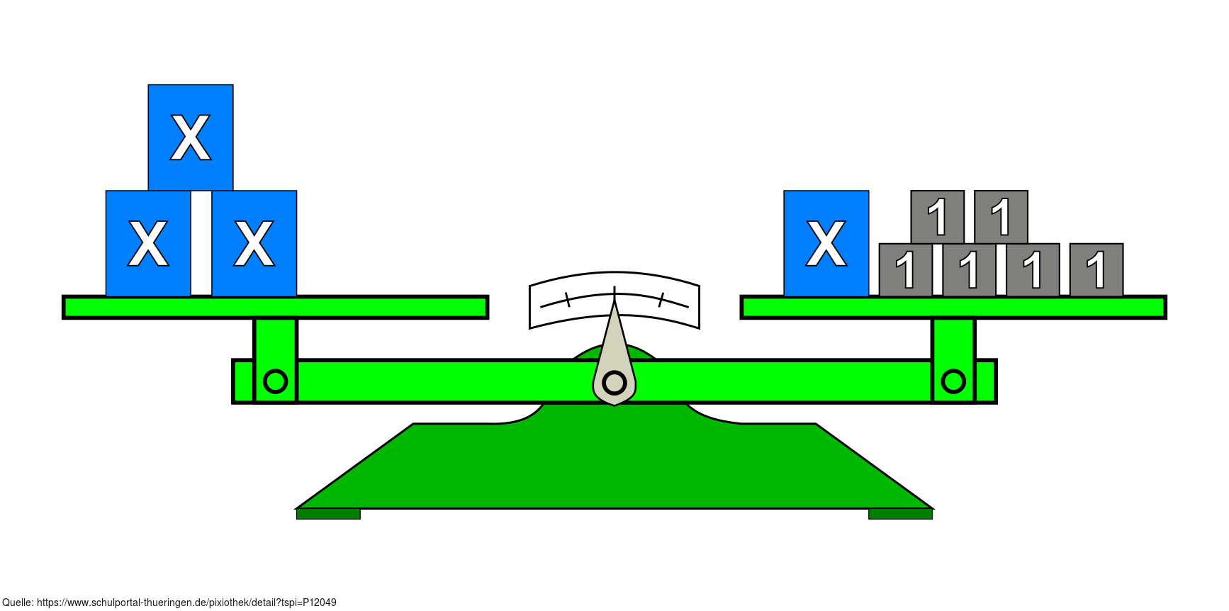 Das Bild gehört zur Serie "Mathematik, Gleichungen". Es veranschaulicht die Lösung einer linearen Gleichung durch Äquivalenzumformung mit dem Bild einer Waage. Zur Gleichung 21 veranschaulichen die Bilder 21-1 bis 21-4 die Umformungsschritte. Das Bild ist unter CC0 lizenziert und kann somit frei verwendet werden.