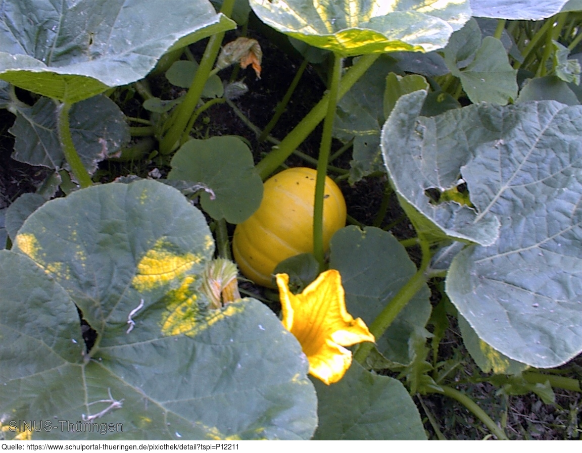 Das Bild gehört zur Serie "Gemüsepflanzen". Es zeigt Blätter und Blüte einer Kürbispflanze. Es gelten die Nutzungsbedingungen der Mediothek und Pixiothek.