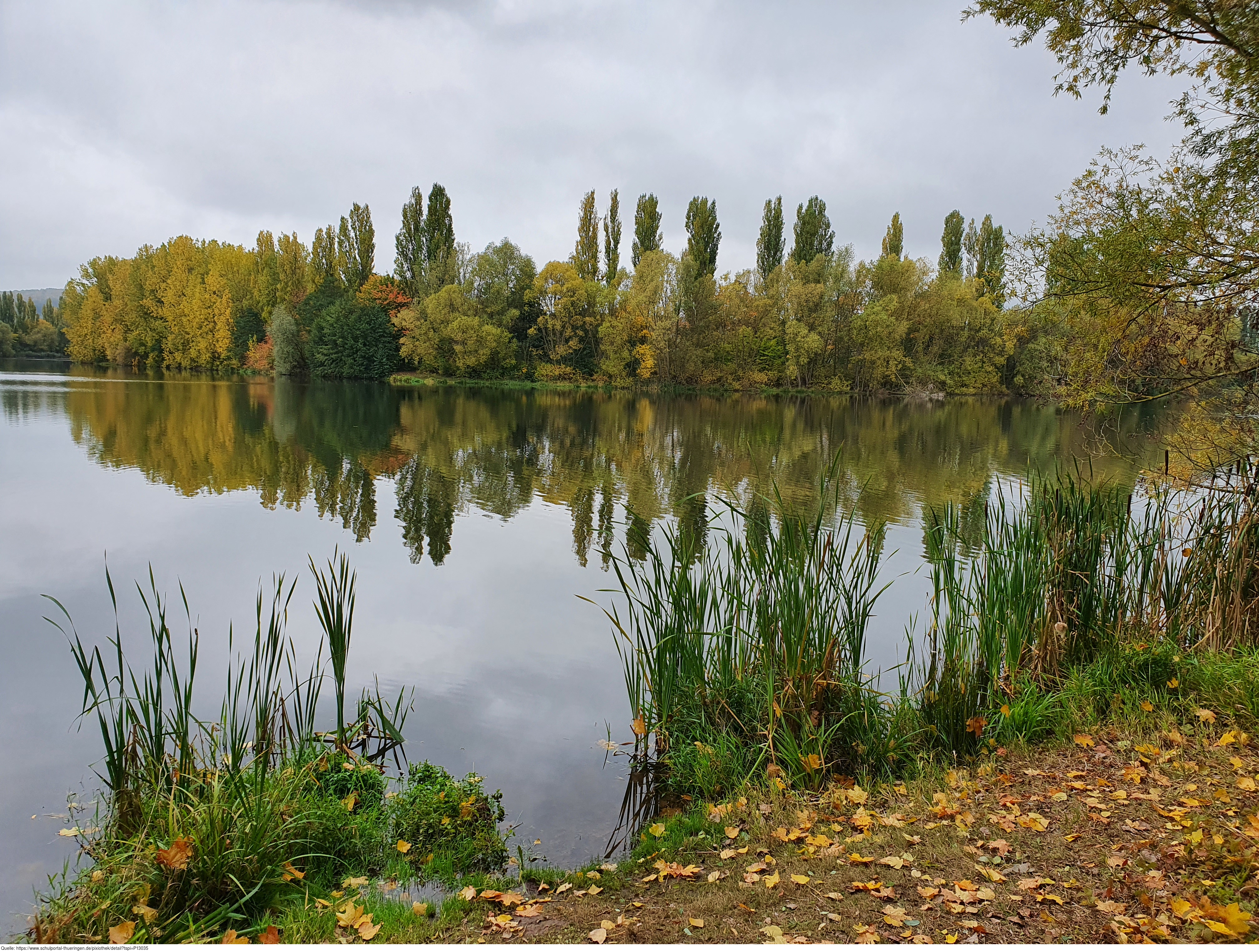 Bäume im Herbstlaub spiegeln sich im See. Es gelten die Nutzungsbedingungen der Mediothek und Pixiothek.