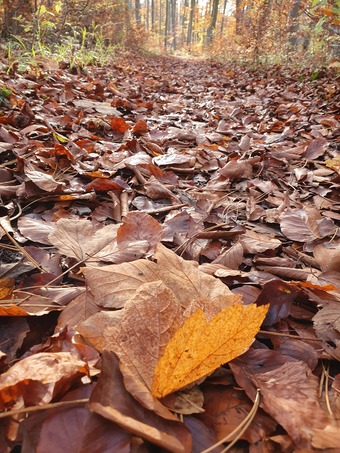 Ein gelbes Blatt ziert einen Weg mit altem Laub. Es gelten die Nutzungsbedingungen der Mediothek und Pixiothek.