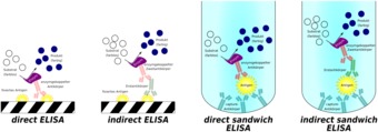 Aufbau verschiedener ELISA-Typen (direct / indirect und Sandwich). Es gelten die Nutzungsbedingungen der Mediothek und Pixiothek. Auf http://unterricht.petzinger.net/biochdropbox.html auch als svg und in CC-BY verfügbar.