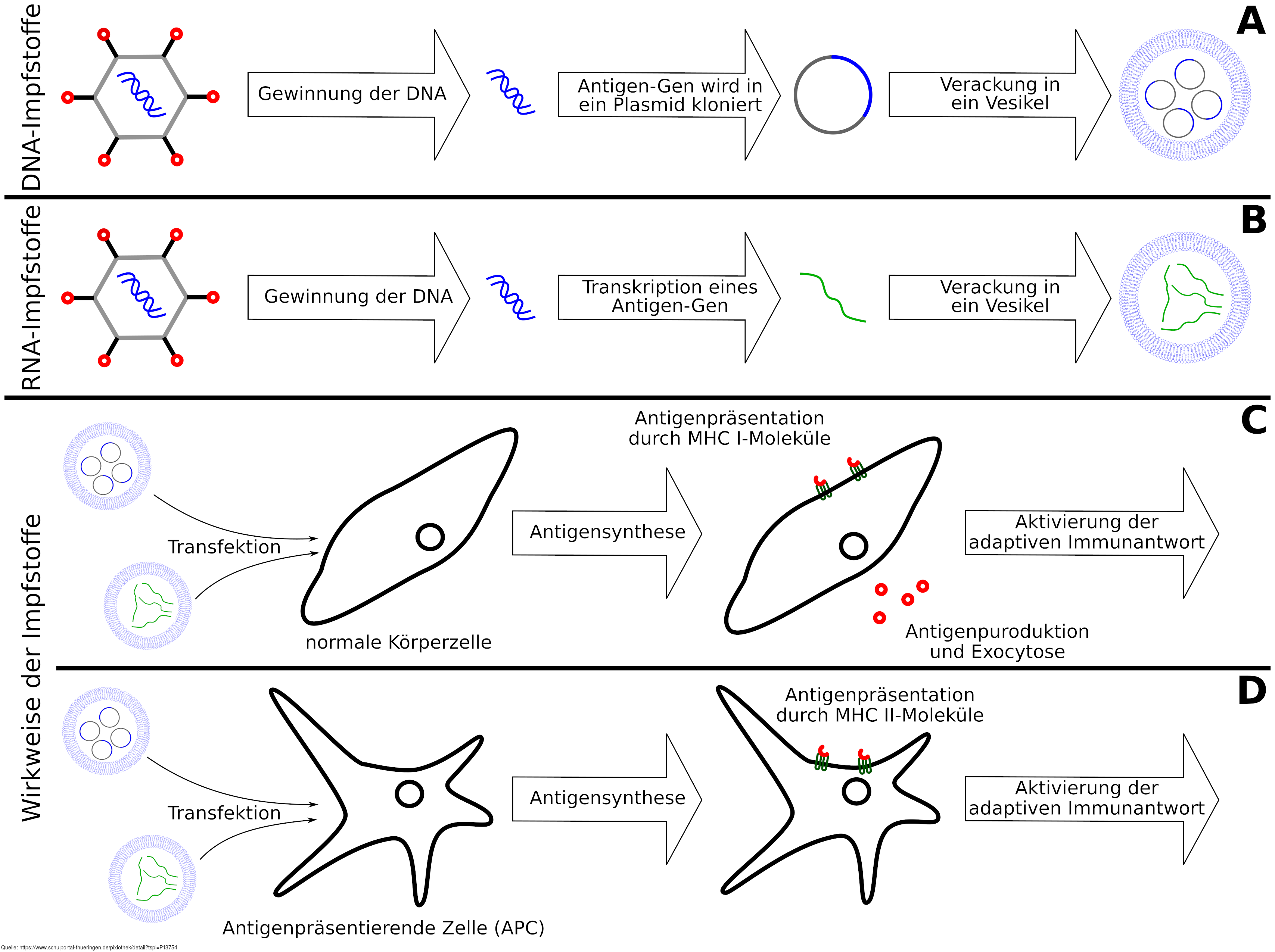 Erzeugung und WIrkung von Impfstoffen auf Erbgut-Basis (DNA und RNA). Es gelten die Nutzungsbedingungen der Mediothek und Pixiothek. Auf http://unterricht.petzinger.net/biochdropbox.html auch als svg und in CC-BY verfügbar.