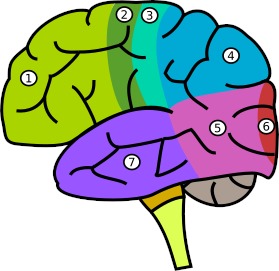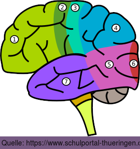 Areale des Großhirns: (1) Frontallappen, (2) somatomotorische Region, (3) somatosensorische Region, (4) Scheitellappen, (5) Hinterhauptslappen, (6) Sehrinde, (7) Schläfenlappen.