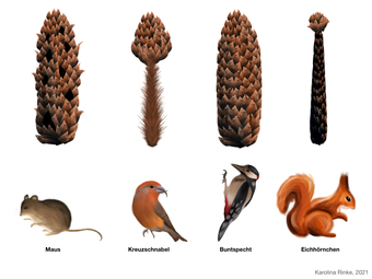 Die Grafik gehört zur Serie "Fraßspuren". Dargestellt sind Zapfenfraßspuren von Maus, Eichhörnchen, Buntspecht und Fichtenkreuzschnabel in falscher Zuordnung, farbig. Es gelten die Nutzungsbedingungen der Mediothek und Pixiothek.