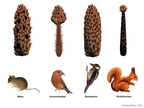 Die Grafik gehört zur Serie "Fraßspuren". Dargestellt sind Zapfenfraßspuren von Maus, Eichhörnchen, Buntspecht und Fichtenkreuzschnabel in richtiger Zuordnung, s/w. Es gelten die Nutzungsbedingungen der Mediothek und Pixiothek.