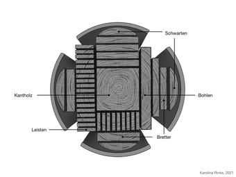 Die Grafik gehört zur Serie "Holzbearbeitung". Dargestellt sind Arten von Schnittholz, die in einem Sägewerk aus einem Baumstamm hergestellt werden, Bild-Variante: s/w, mit Beschriftung. Es gelten die Nutzungsbedingungen der Mediothek und Pixiothek.