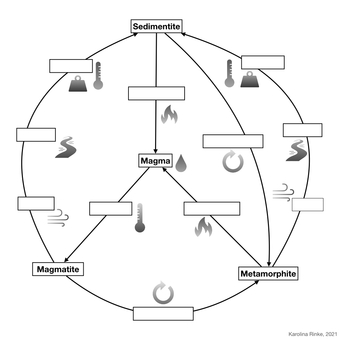 Das Bild verdeutlicht den Gesteinskreislauf. Bild-Variante: s/w; unbeschriftet. Es gelten die Nutzungsbedingungen der Mediothek und Pixiothek.