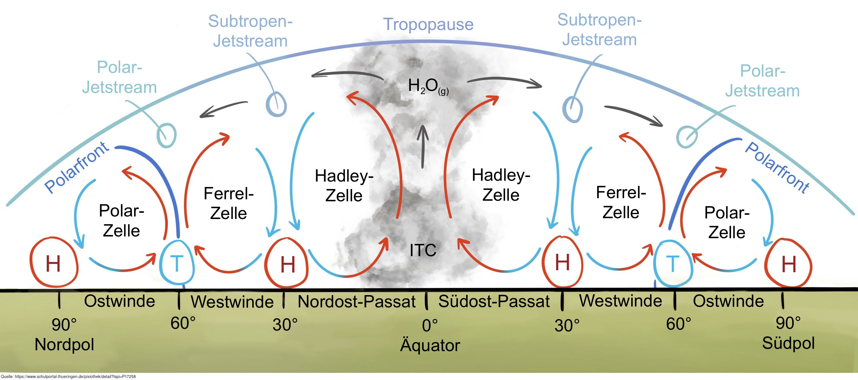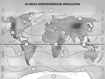 Das Bild gehört zur Serie „Zirkulationssysteme der Erde“. Es verdeutlicht die globale atmosphärische Zirkulation der Erde. Bild-Variante: s/w; teilbeschriftet. Es gelten die Nutzungsbedingungen der Mediothek und Pixiothek.
