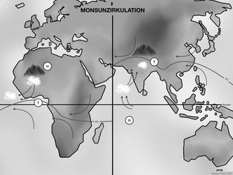Das Bild gehört zur Serie „Zirkulationssysteme der Erde“. Es verdeutlicht die Monsunzirkulation der Erde. Bild-Variante: s/w; unbeschriftet; mit Pfeilen für Winde. Es gelten die Nutzungsbedingungen der Mediothek und Pixiothek.
