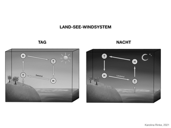 Das Bild gehört zur Serie „Zirkulationssysteme der Erde“. Es verdeutlicht das Land-See-Windsystem der Erde. Bild-Variante: s/w; beschriftet. Es gelten die Nutzungsbedingungen der Mediothek und Pixiothek.