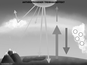 Das Bild verdeutlicht den anthropogenen Treibhauseffekt. Bild-Variante: s/w; unbeschriftet. Es gelten die Nutzungsbedingungen der Mediothek und Pixiothek.