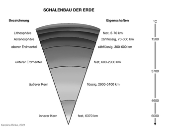 Das Bild verdeutlicht den Schalenaufbau der Erde. Bild-Variante: s/w; beschriftet. Es gelten die Nutzungsbedingungen der Mediothek und Pixiothek.
