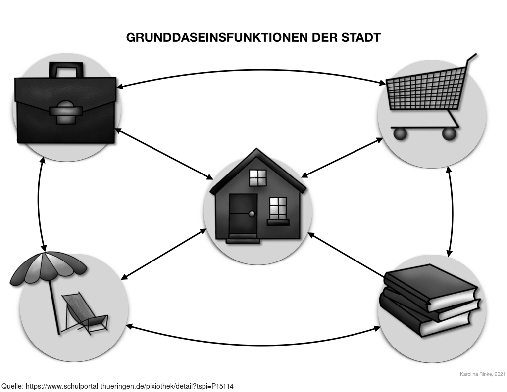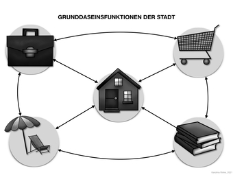 Das Bild verdeutlicht die Grunddaseinsfunktionen (der Stadt). Bild-Variante: sw; unbeschriftet. Es gelten die Nutzungsbedingungen der Mediothek und Pixiothek.
