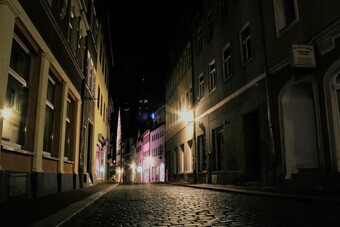 Motiv eines Stadtrundganges durch Pößneck (Ostthüringen) bei Nacht. Abgebildet ist der Steinweg mit Blick zum Rathaus. Es gelten die Nutzungsbedingungen der Mediothek und Pixiothek.