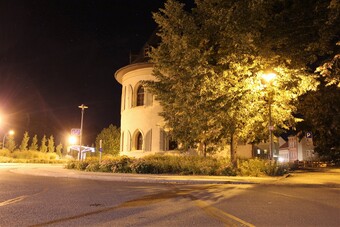 Motiv eines Stadtrundganges durch Pößneck (Ostthüringen) bei Nacht. Blick auf den Glockentum am Busbahnhof. Es gelten die Nutzungsbedingungen der Mediothek und Pixiothek.