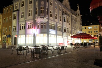 Motiv eines Stadtrundganges durch Pößneck (Ostthüringen) bei Nacht. Abgebildet ist das Gebäude in der Fußgängerzone, in welchem sich die Geschäftsräume der Kreissparkasse Saale-Orla befinden. Es gelten die Nutzungsbedingungen der Mediothek und Pixiothek.