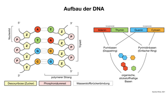 Das Bild verdeutlicht den Aufbau der DNA. Bild-Variante: farbig; beschriftet. Es gelten die Nutzungsbedingungen der Mediothek und Pixiothek.