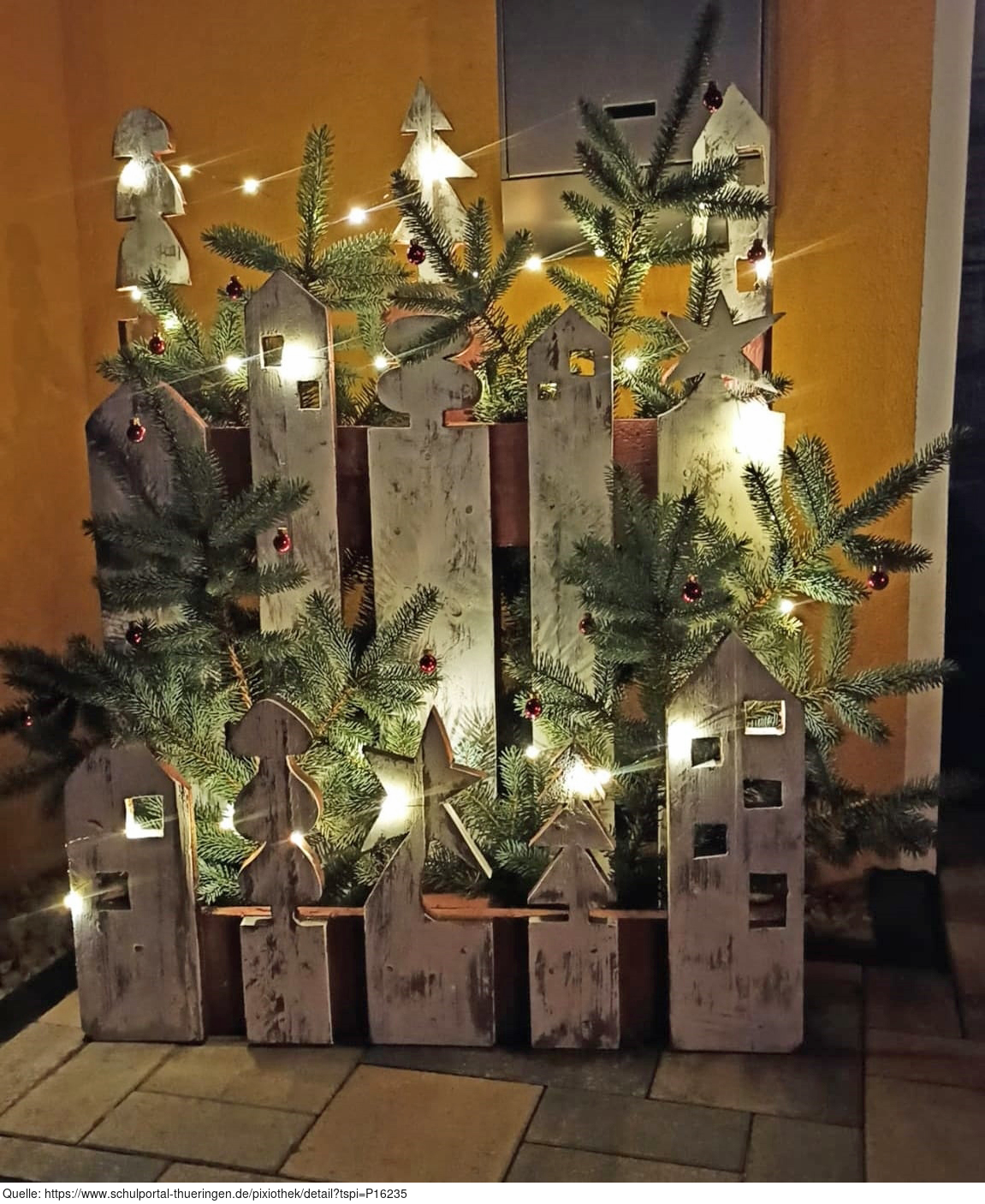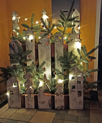 Das Foto gehört zur Serie "Weihnacht". Es zeigt eine Weihnachtsdekoration, hergestellt aus einer Euro-Palette. Es gelten die Nutzungsbedingungen der Mediothek und Pixiothek.