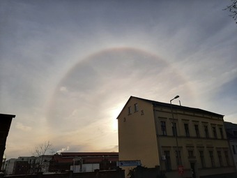 Das Foto zeigt einen Halo, aufgenommen am 5. 2. 23 in Biesdorf (Berlin-Marzahn) um 15 Uhr. Bei einem Halo wird Licht an Eiskristallen in der Luft gebrochen. Anders als beim Regenbogen blickt man in Richtung der Sonne. Es gelten die Nutzungsbedingungen der Mediothek und Pixiothek.
