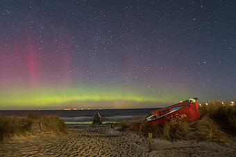 Das Bild gehört zur Serie „Polarlichter 2023 Zingst“. Es zeigt Polarlichter, die in der Nacht vom 26. Auf den 27. Februar 2023 gegen 0:30 in Zingst auf dem Darß mit einer Canon EOS RP aufgenommen wurden. Die Kameraeinstellungen: ISO 1600; Blende 2,8; 15 Sekunden Belichtung; manueller Modus. Das Foto wurde nachträglich bearbeitet. Mit bloßem Auge waren die Polarlichter in dieser Nacht deutlich zu sehen, aber natürlich nicht so farbenfroh wie auf dem Foto. Es gelten die Nutzungsbedingungen der Mediothek und Pixiothek.
