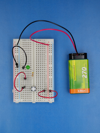 Das Bild zeigt einen auf einem sogenannten Breadboard realisierten Schaltkreis mit einer LED, passendem Vorwiderstand sowie einem Taster zur Aktivierung der LED. Es gelten die Nutzungsbedingungen der Mediothek und Pixiothek.
