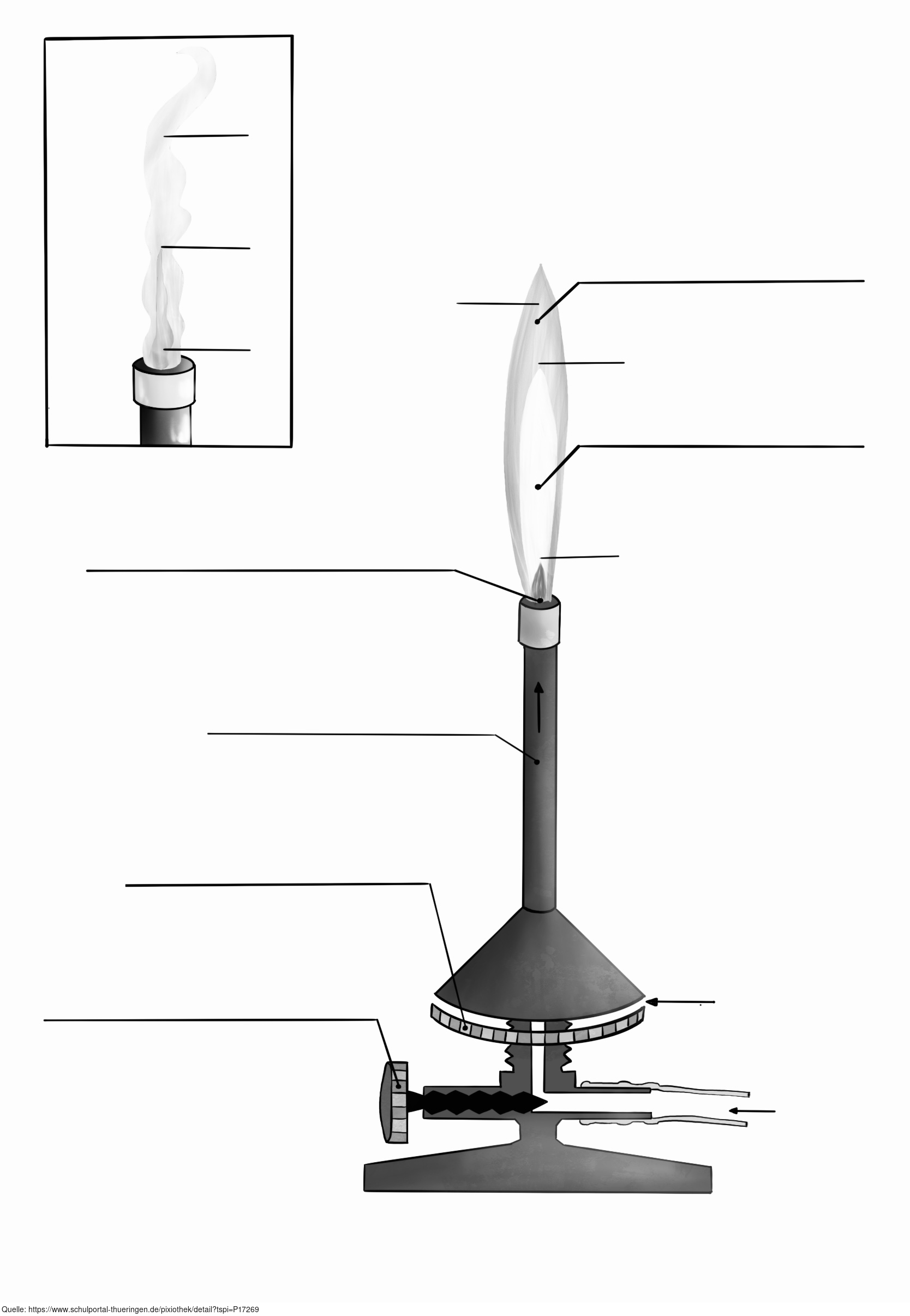 Das Bild verdeutlicht den Aufbau eines Bunsenbrenners. Variante: zwei Flammen, s/w; unbeschriftet. Es gelten die Nutzungsbedingungen der Mediothek und Pixiothek.