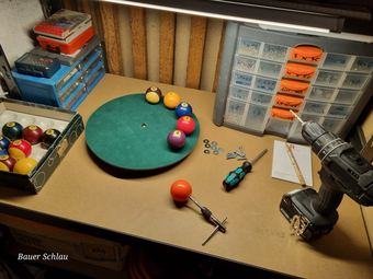 Das Bild zeigt eine Uhr unter Verwendung von Billardkugeln. Das Foto kann als Anregung für ein Technikprojekt dienen. Es gelten die Nutzungsbedingungen der Mediothek und Pixiothek.
