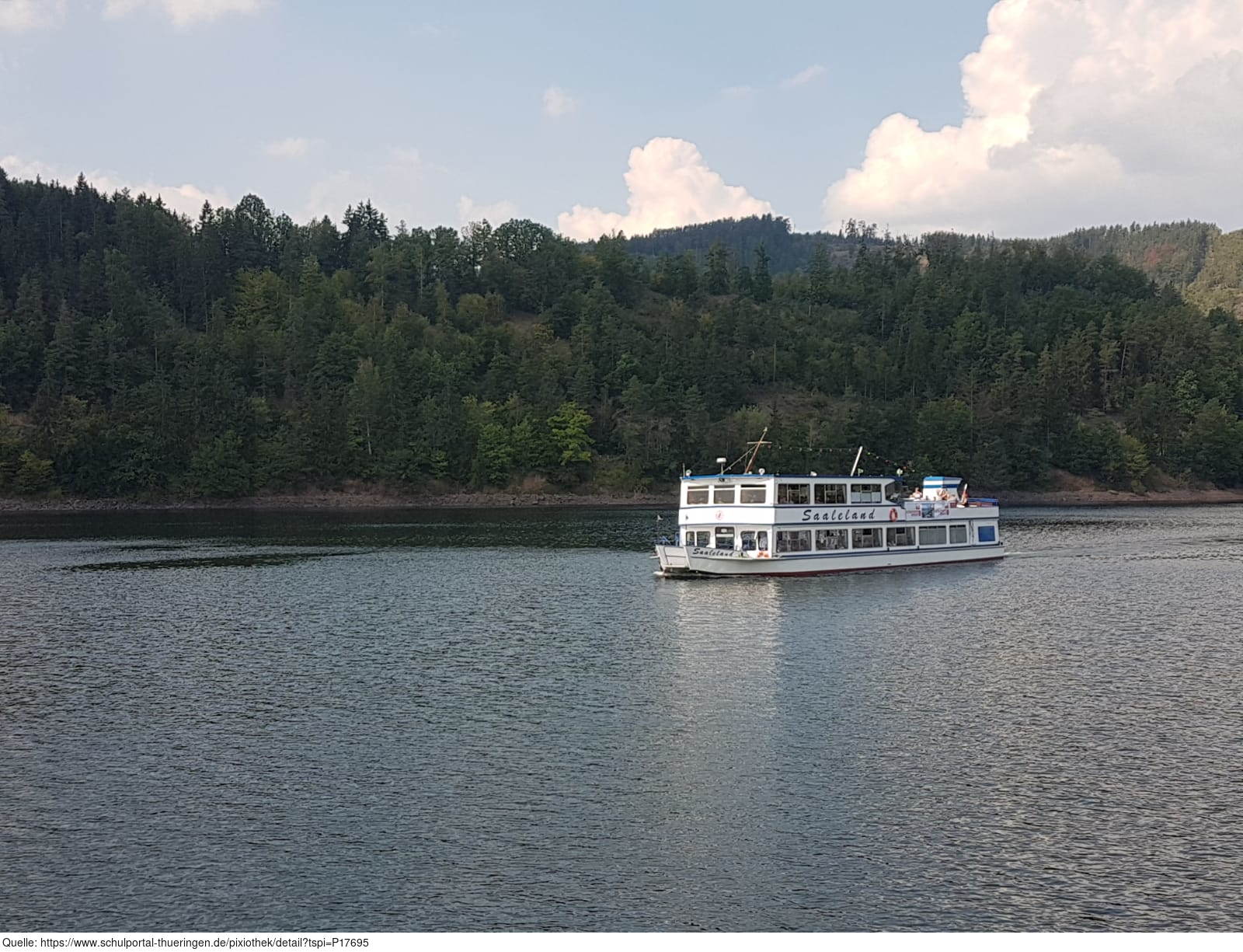 Das Bild zeigt die MS "Saaleland" der Fahrgastschifffahrt Hohenwarte. Das MS „Saaleland“ wurde 1983 als MS „Lipperland“ in der Schiffswerft Oberweser gebaut. Auf einer Länge von 29,5 m, einer Breite von 6,1 m und einem Leergewicht von 100 t bietet es Platz für 348 Personen.