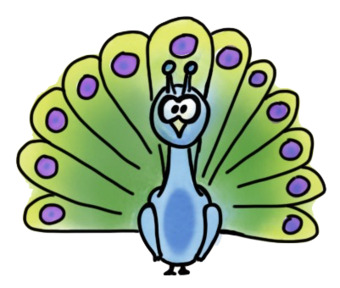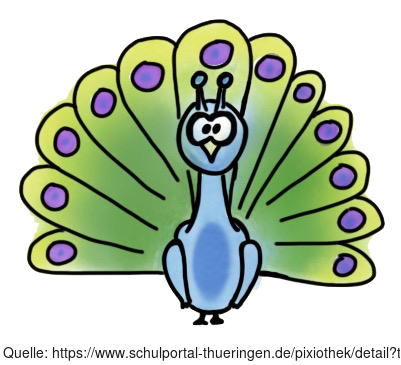 Das Bild zeigt einen gezeichneten Pfau. Das Bild ist unter CC0 lizenziert und kann somit frei verwendet werden. Es ist neben weiteren Bildern auch hier zu finden: https://moodlelab.moodlesc​​​​hule.de/